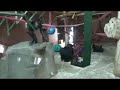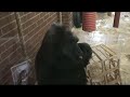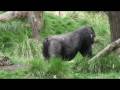 In this clip, a baby Chimpanzee appears to play with a Baboon although it may be more properly considered sparring. Two Gorillas are seen to be sparring in this clip. Their teeth are bared.
