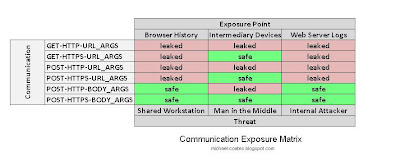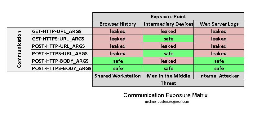 Here is a quick chart showing the data exposure when considering GET vs POST and also HTTP vs HTTPS.
