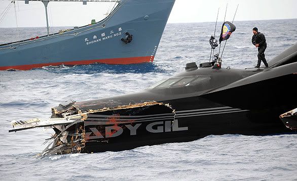 This photo from the Sea Shepherd group shows its trimaran Ady Gil, a wave-piercing boat formerly known as Earthrace, being rammed by a Japanese whaling vessel in Antarctic waters. The Space Age powerboat sent to harass Japanese whalers was rammed and sliced in two in its very first clash, activists said, dramatically escalating hostilities.