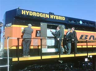 A Burlington Northern Santa Fe (BNSF) hydrogen train (hydrail) rolled into Southern California this week to meet Governor Arnold Schwarzenegger. The hydrail locomotive is powered by hydrogen fuel cell plus hybrid technology.