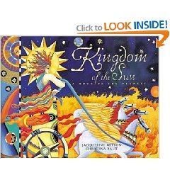 Kingdom of the Sun A Book of the Planets written by Jacqueline Mitton and illustrated by Christina Balit is a book written about our sun, moon and the planets in our solar system. The book starts with an explanation of how “planets,” named from the Greek word for “wanderers,” were discovered and named. At first, they were named for Greek gods and a goddesses. Now they are named after Roman Gods and a Goddess except for Uranus (which is named for a Greek god). The sun is the first celestial body that is explained. Mitton writes about each celestial body in first person. For example, “THE SUN– A MASSIVE BALL OF GLOWING FLAME, I am sovereign over nine planets.” (Mitton, pg 6) Pluto is included as one of the planets. For each celestial body, there is an illustration of the god or goddess. The illustrations by Balit are large and beautiful. Mitton starts with the sun, then the moon, and finally describes the planets in order from Mercury through Pluto. The book shows the size of the earth compared to the planets. On the final two pages, there is a glossary and other facts about the planets, the sun and the moon such as, the number of moons each planet has, the distance the planet is from the sun, and the time it takes for a planet to orbit the sun.