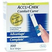 Curved: The blood glucose test strips are curved to fit your finger for easier and more comfortable blood application. Small Sample Size: The smaller sample size required by the meter and unique capillary action that pulls blood into the test strip means less pain and easier blood application. Touchable: These diabetes test strips were uniquely designed to be touchable, so there is no need to retest if the strip gets touched, making it ideal for people of all ages. Indicator Window: With the Accu-Chek Comfort Curve Test Strips it is easy to tell if there is enough blood for proper testing. If the yellow indicator window is full, there is enough blood for accurate testing results. If not, more blood can be applied up to a full 15 seconds later, so painful retesting can be avoided. Electrodes: These diabetes test strips feature quality electrodes with palladium to ensure highly reliable, accurate results, even at extreme temperatures between 57 and 104 degrees Fahrenheit. Package contains 100 Test Strips Note: 2 boxes of 50’s may substitute this item. Expiration date is 12+ months. Guaranteed! Comfort Curve Test Strips were designed for use with Accu-Chek Advantage and Accu-Chek Complete meters. Both these blood glucose meters are lightweight and easy to use, which makes testing blood sugar levels quicker and more convenient. The Accu-Chek Complete stores blood sugar, insulin type and dose, carbohydrates, exercise, event markers and more information by time and date.