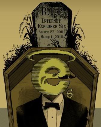 Internet Explorer 6, residente na internet por mais de 8 anos, morreu na manhã de 1 de março de 2010, em Mountain View, na Califórnia, como resultado de um ferimento sofrido na sede da Google Inc. Internet Explorer 6, conhecido por amigos e pela família como “IE6,” deixa filho, Internet Explorer 7, e neto, Internet Explorer 8. Mais detalhes no site IE6 Funeral