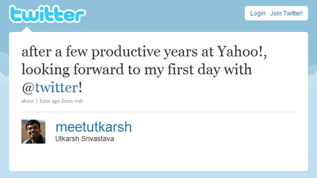 Today, as is often the case, one tech company’s loss became another’s gain. Utkarsh Srivastava has left Yahoo after spending more than three years as a senior research scientist there, and Srivastava confirmed (in well under 140 characters) that he’ll land at Twitter.