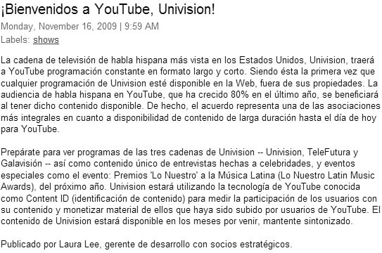 On the YouTube Blog, Strategic Partner Development Manager Laura Lee explained the importance of this arrangement by noting that the size of YouTube’s Hispanic audience has increased by 80 percent in the last year. She also stated that this deal counts as "one of YouTube’s most comprehensive partnerships for full-length content to date."