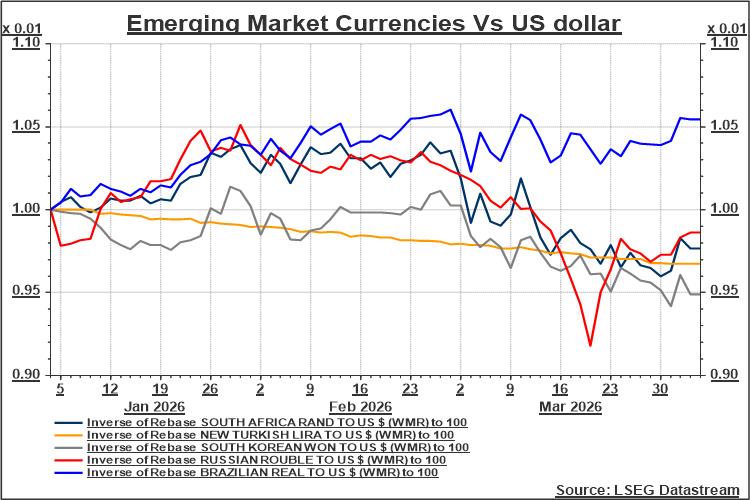 And the dollar move is just starting to play out big in emerging markets, where emerging market currencies are on the back foot everywhere from Turkey to South Africa, South Korea and others. The reaction so far as been to lift local stock markets on potential exporter relief but a big question moving ahead is to what extent persistent exchange rate weakness will start to deter or even reverse foreign investment flows.